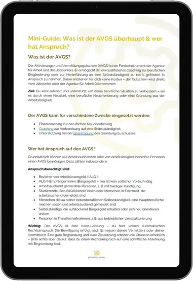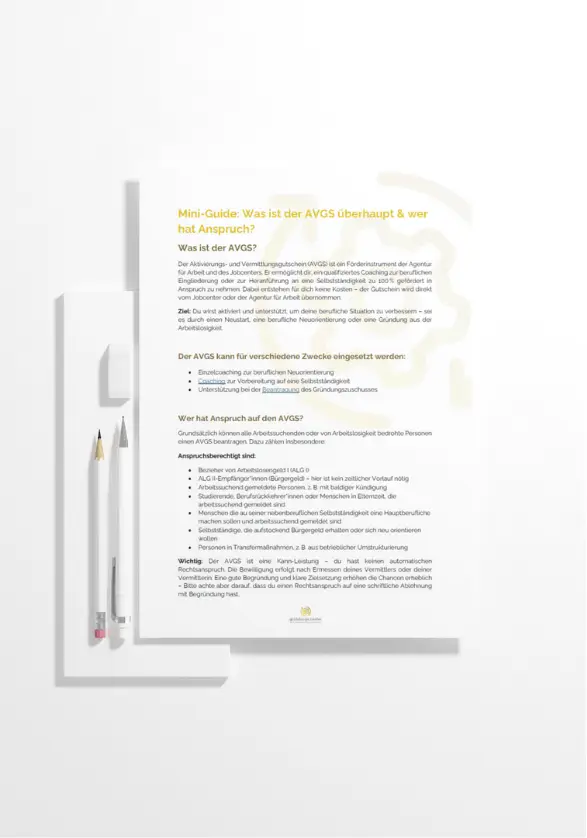 AVGS steht für Aktivierungs- und Vermittlungsgutschein. Damit kannst du dir z. B. ein kostenloses Gründungscoaching sichern, wenn du arbeitslos bist oder arbeitssuchend gemeldet bist. Die Kosten übernimmt dann die Agentur für Arbeit oder das Jobcenter – du zahlst nichts.