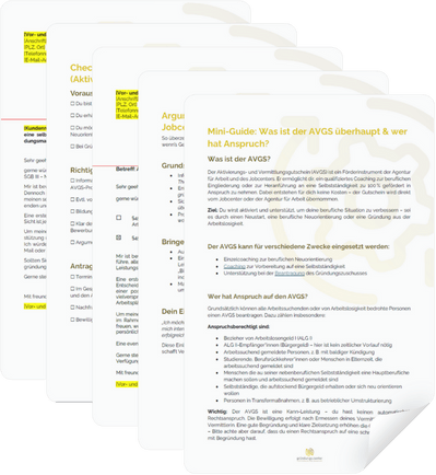 Du willst dein Gründungscoaching starten, aber weißt nicht, wie du den AVGS bekommst? Mit unserer Argumentationshilfe + Vorlagen gehst du vorbereitet ins Gespräch mit deinem Jobcenter oder deiner Agentur für Arbeit.